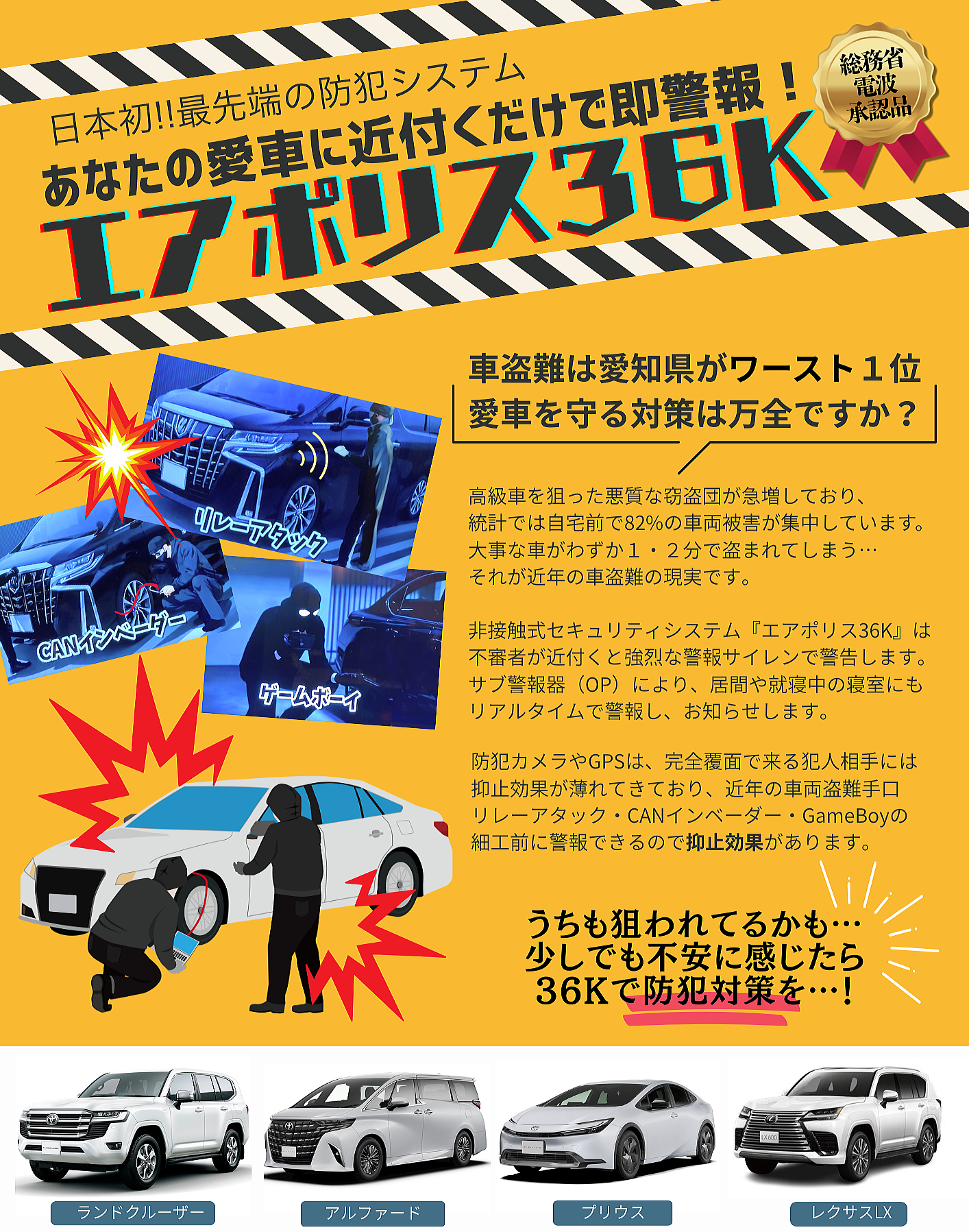 | ■ 車の盗難 ■ 近年急増している車の盗難は、流行りの 盗難アイテムを使用し数分の犯行です。 車に近寄り感知した犯人に対し、 犯行前に警報作動します。 |