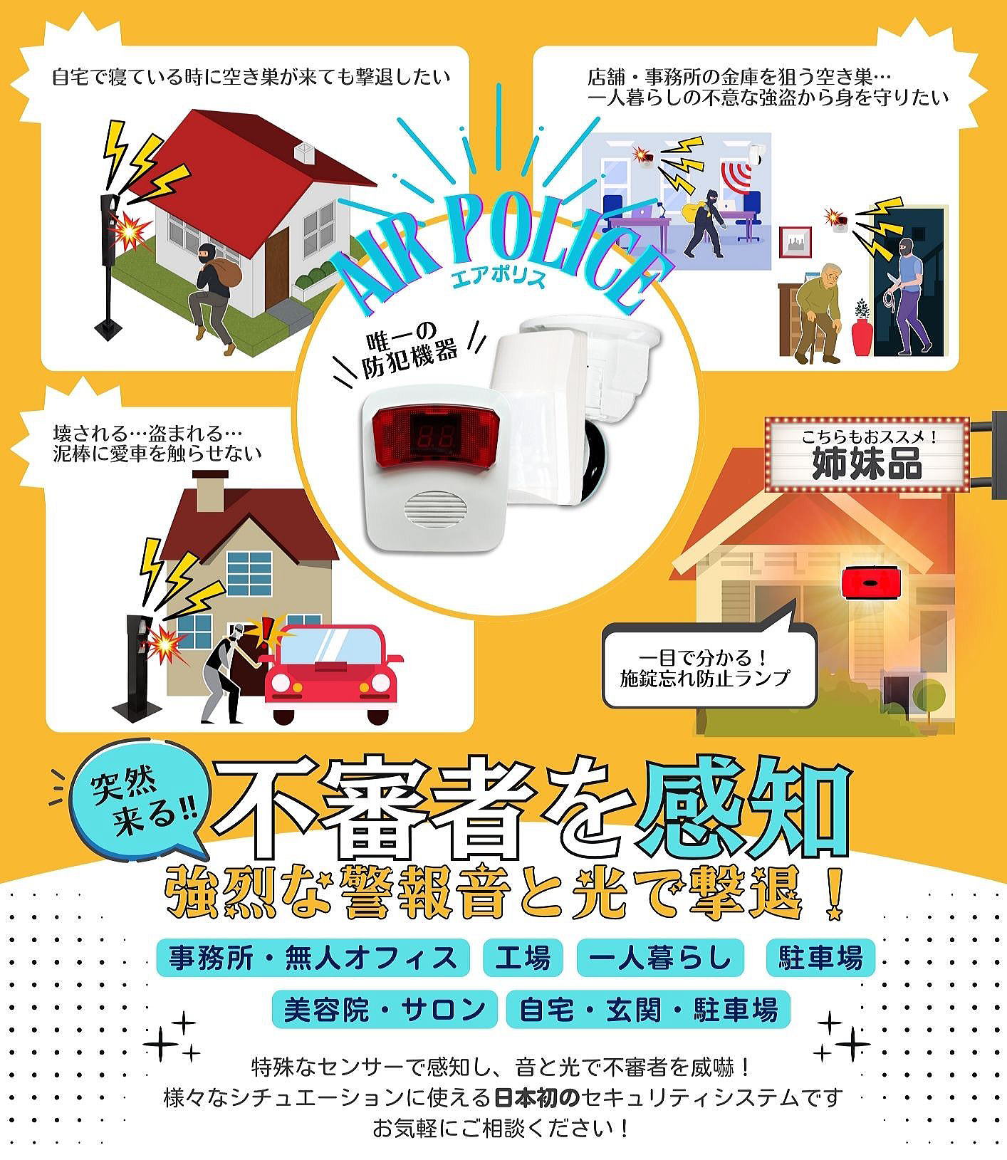 ■ 無人事務所や店舗の防犯 ■ 休日で人がいない事務所や サロン・店舗を狙った空き巣が増えています。 事務所内に入ってきた空き巣を感知し、 強烈な警報サイレンを鳴らします。 |